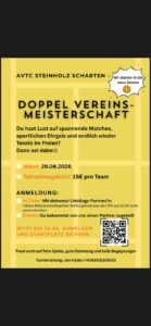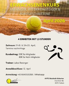 AKTUELLES Für alle motivierten Tennis Einsteiger und fortgeschrittenen Wiedereinsteiger findet ab Ende April ein Auffrischungskurs statt. Für Fragen zum Kurs oder Anmeldung unter +43 664 5515358 Sportliche Grüße Lukas Reisinger