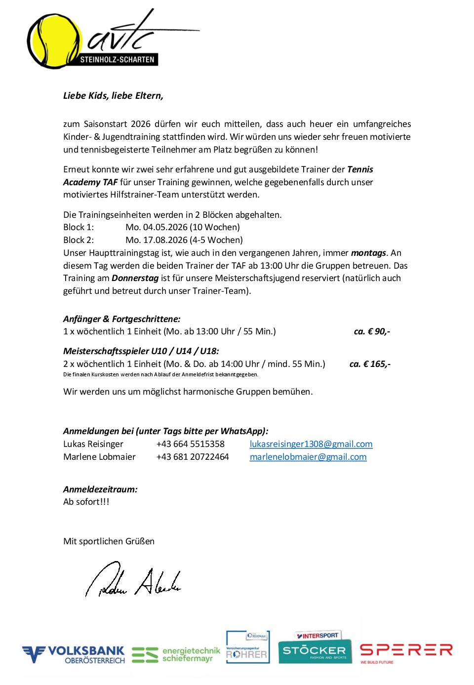 Für alle motivierten Tennis Einsteiger und fortgeschrittenen Wiedereinsteiger findet ab Ende April ein Auffrischungskurs statt. Die Termine sind: 17+18.4. 24.4.+25.4. Für Fragen zum Kurs oder Anmeldung unter +43 664 5515358 Sportliche Grüße Lukas Reisinger